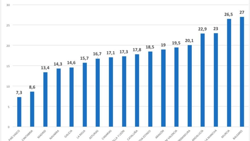 Por el contrario, las comunidades con menores tasas son Euskadi (7,3%), Cantabria (8,6%), Madrid (13,4%), Navarra (14,3%), Galicia (14,6%), La Rioja (15,7%) y Asturias (16,7%). El diferencial entre la comunidad de menor tasa de abandono, el País Vasco, y la mayor, Baleares, es de casi veinte puntos porcentuales. Mientras, el desempleo juvenil en Euskadi es del 27,97% y el de Baleares 41,77%, un porcentaje que Canarias supera en siete puntos hasta llegar al 48,75%.