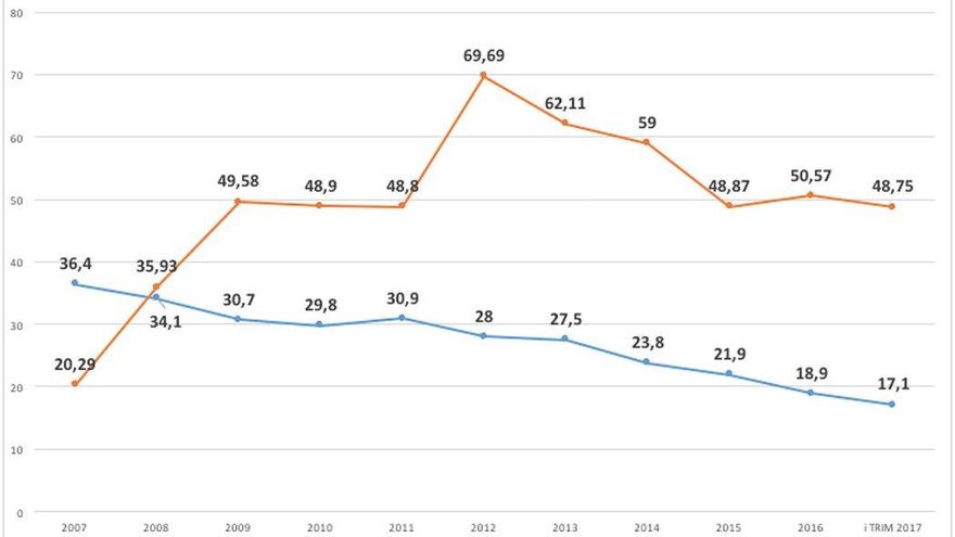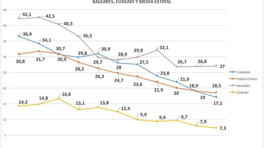 Hace apenas diez años las tasas de abandono escolar temprano de Canarias superaban el 36%. Hoy, con un 17,1%, suponen la mitad de entonces y se sitúan 1,4 puntos por debajo de la media estatal (18,5%). Lejos del 27% de Baleares, que encabeza negativamente la lista, seguida por Murcia (26,5%); y, también, a años luz de la comunidad ejemplar en este y otros asuntos, Euskadi, que, con un 7,3%, tiene datos de país europeo desarrollado, que junto con Cantabria (8,6%) se sitúan incluso por debajo de la media europea (10,7%). Algo ha tenido que ver la crisis económica y la imposibilidad de nuestros jóvenes de saltar al mercado laboral sin la menor cualificación, con destino a la construcción y a la hostelería, como sucedió en los noventa y en la primera década de este siglo XXI. Y, asimismo, el incremento de la oferta en Formación Profesional, aunque aún sea insuficiente.