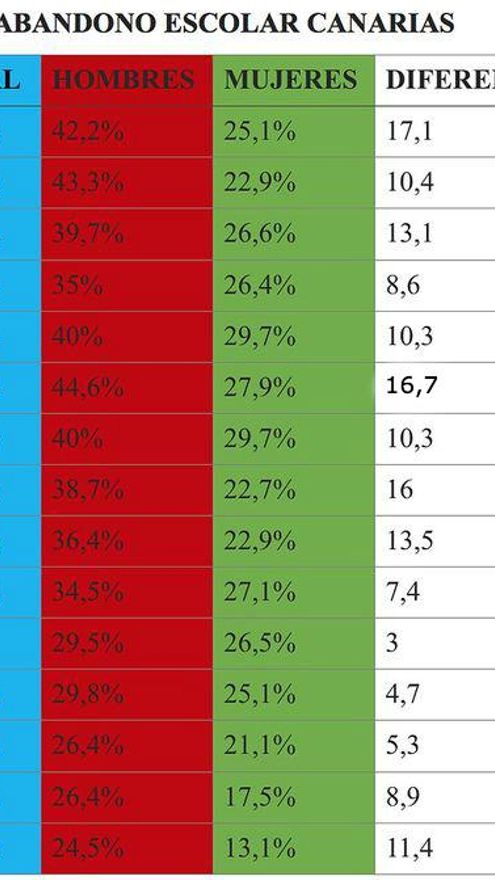 El abandono es mayor en los hombres que en las mujeres. Así, si el estatal global más reciente es el 18,5%, a los hombres corresponde un 22,1 % y a las mujeres el 14,8%, más de siete puntos de diferencia. En Canarias, las diferencias son aún mayores, de 11,4 en 2016 (24,5% de abandono masculino frente al 13,1% de las mujeres). Curiosamente, las distancias se acercaron notablemente en los años más duros de la reciente crisis: apenas 3 puntos en 2012, 4,7 en 2013 y 5,3 en 2014.