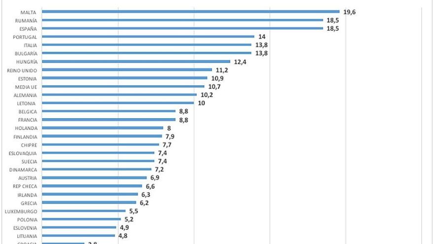 En el ámbito de la Unión Europea, España presenta uno de los peores datos. Empatada con Rumanía (18,5%) y solo superada por Malta (19,6%). Las tasas más bajas las tienen Croacia (2,8%), Lituania (4,8%), Eslovenia (4,9%), y Polonia 5,2%). En torno al 7% se mueven Austria, Dinamarca y Suecia. Finlandia tiene un 7,9%, Francia un 8,8%, Reino Unido un 11,2% e Italia un 13,8%. La media europea se situó a finales de 2016 en el 10,7%. Dos comunidades españolas, País Vasco y Cantabria, se encuentran varios puntos por debajo de la misma.