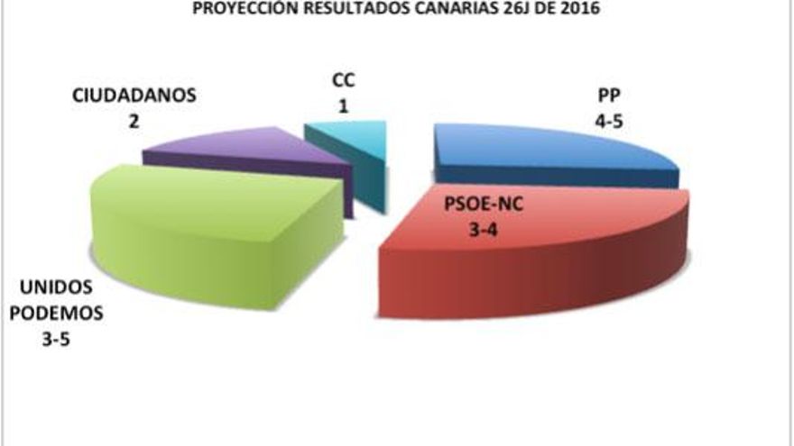 El panorama global en la Comunidad Canaria (dos circunscripciones, 15 escaños) podría quedar así: PP (4-5), Unidos Podemos (3-5), PSOE-NC (3-4), Ciudadanos (2) y CC (1).