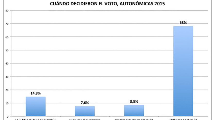 ¿Cuándo se decide el voto? La gran mayoría parece tenerlo claro mucho antes del arranque de la campaña electoral. Pero todo indica que cada vez son más los que retrasan en el tiempo la decisión. Sucedió en las europeas de 2014, dificultando en gran medida el acierto de las empresas demoscópicas que ya tenían una dura tarea con tratar de medir el grado de irrupción de las nuevas formaciones políticas.