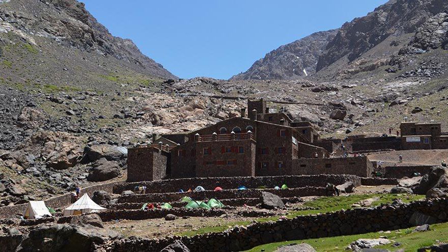 Estas paradas han sido ya acordadas por José Santiago y Omar para evitar el mal de altura del que de momento escapamos todos. Un último esfuerzo en silencio nos permite por fin ver el refugio a cierta distancia. Esta construcción revestida de piedra está gestionada por el C.A.F. (Club Alpin Français de Casablanca) y situado a una altura de 3.207 m.