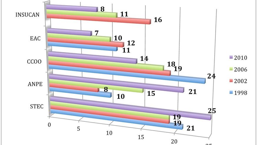 Sus efectos se notaron en 2010. En los resultados y en la bajada en la participación. El STEC fue el principal beneficiado, seguido de una ANPE que continuaba escalando posiciones, mientras que CCOO, UCPL y EA-C padecían un relevante descenso.