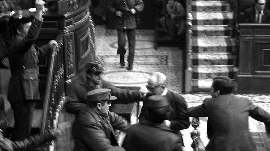 Esa desaparición, por distintas razones, era también deseada por muchos de los que integraban las filas de la UCD; la concatenación de conspiraciones internas, el constante ruido de sables y la retirada del apoyo del Rey parecen estar detrás de la dimisión de Adolfo Suárez en enero de 1981. En su breve discurso televisado de aquella anoche afirmó lo siguiente: “Yo no quiero que el sistema democrático de convivencia sea una vez más, un paréntesis en la historia de España”. En lo que parece una clara premonición del 23-F.