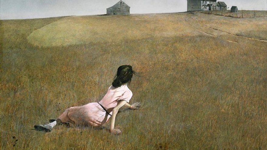 Un campo dorado al atardecer llena el espacio. En él, una figura femenina parece arrastrarse, retorciéndose sobre la hierba, mientras alza la vista hacia la vieja granja del fondo. ¿Quién es esa mujer? ¿Qué le ocurre? ¿Necesita ayuda? ¿En qué piensa? Las preguntas se amontonan en la que es, sin duda, la pintura más reconocible de Wyeth: Christina’s World.