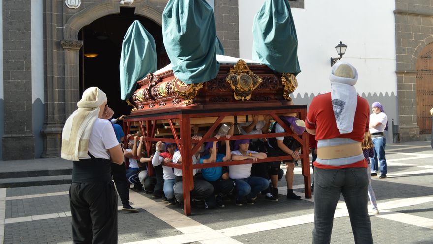 Por su parte, la Hermandad de la que es Hermano Mayor Rivero es un paso que pesa en torno a los 800 kilos y que es cargada por una cuadrilla mixta de unas 26 personas, de los que cuatro son personas que están internas en la prisión provincial de Salto del Negro. En total realizan ocho ensayos para esta Semana Santa y como tienen la particularidad de que algunos de la cuadrillas son reclutas, estos solo participan en los dos últimos ensayos, que tienen lugar el martes y el miércoles de la semana anterior a la procesión. No obstante, estas personas aprenden cómo se carga y camina en las propias instalaciones del recinto penitenciario con un trono antiguo, adonde acude el contracapataz para enseñarles las mañas.