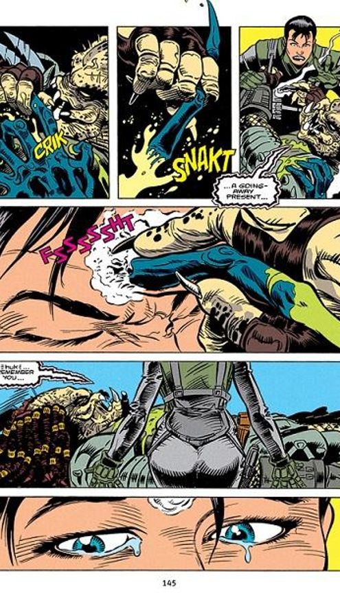 Otro de los grandes aciertos del guion radica en plantear a la raza de los Yautja “Depredadores” como algo más que unos seres que solamente disfrutan con el acto de la caza. Tal y como dejan claras las páginas de esta historia, el Depredador capturado y que, luego, cuida la doctora Miriam Revna no dudará en tratar de ayudar a ésta, llegado el momento, a pesar de que su actitud le supondrá tener que enfrentarse con un miembro de su propia raza. En esto, Aliens vs Predator propone lo mismo que la injustamente ignorada secuela Predator 2 (Stephen Hopkins, 1990), película que en sus secuencias finales nos muestra que los Depredadores son capaces de mostrar respecto para con un antagonista tan capaz y decidido como lo es el teniente Michael “Mike” R. Harrigan (Danny Glover). Esto explica el regalo que el humano recibe del líder de los Depredadores, una pistola “Flintlock” de principios del siglo XVII, arma que demuestra que la raza lleva siglo viniendo “de caza” hasta el planeta Tierra.