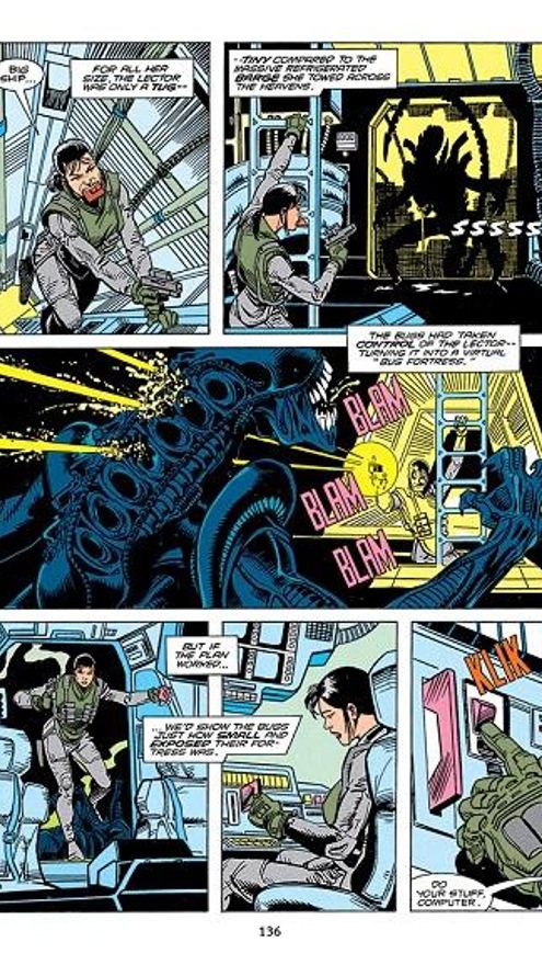 Un lustro después, y en una secuela que se desarrolla cincuenta y siete años después de la primera película, Ellen Ripley deberá volver a verse las caras con más criaturas, incluyendo una majestuosa reina Alien que, como ella misma al asumir el papel de protectora de la joven Newt, luchará por defender a su camada. En esta ocasión, la suboficial de vuelo degradada contará con el apoyo de otra fémina de cuidado, la soldado Vásquez (Jenette Goldstein). El problema con esta aguerrida y dispuesta marine espacial es que, al revés de lo que luego le sucede a Machiko Noguchi en las páginas de la serie gráfica, Vásquez tiene poco espacio para demostrar toda su valía, salvo cuando junto a su compañero de armas, el soldado Drake (Mark Rolston), toman la iniciativa para salir del atolladero en el que están atrapados, merced a la incompetencia de su superior directo, el teniente William Gorman (William Hope). Lo paradójico del caso es que será Vásquez quien con su posterior entrega y sacrificio redima la falta de experiencia y la notable incapacidad de Gorman quien, por una vez SÍ sabrá qué hacer llegado el momento.
