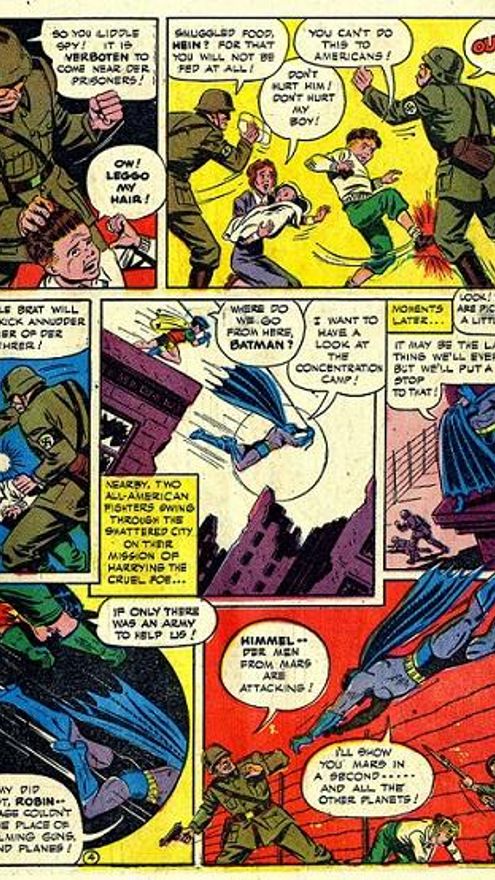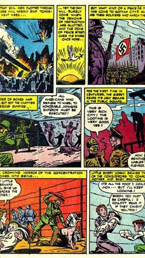En la entrega número quince de la serie Batman titulada The Two Futures (FP: febrero-marzo 1943) el guionista Bill Finger -junto con el dibujante Jack Burnley y el entintador Ray Burnley- fue un paso más allá y mostró la realidad del escenario bélico mundial, donde las destructivas y sanguinarias fuerzas del Eje han ocupado Gotham City. De ahí que los autores no duden en mostrar paredones de fusilamiento, cuerpos ahorcados y guardias apaleando personas dentro del recinto de un campo de concentración, calcado a los que la Alemania nacionalsocialista había diseminado por buena parte de Europa. Estas páginas también cuentan la historia de Bobby Logan, un niño empeñado en ayudar a paliar el hambre que sufre su familia y que no dudará en ayudar al dúo de héroes, hecho que le supondrá poner su vida en peligro, ante la barbarie que se desarrolla a su alrededor. Son siete páginas desconocidas por el gran público, pero que deberían ser rescatadas y, en cierto modo, admiradas por ser capaces de plasmar, en un cómic de super héroes, lo que buena parte de la población mundial estaba sufriendo, de una manera clara, directa y sin concesiones.