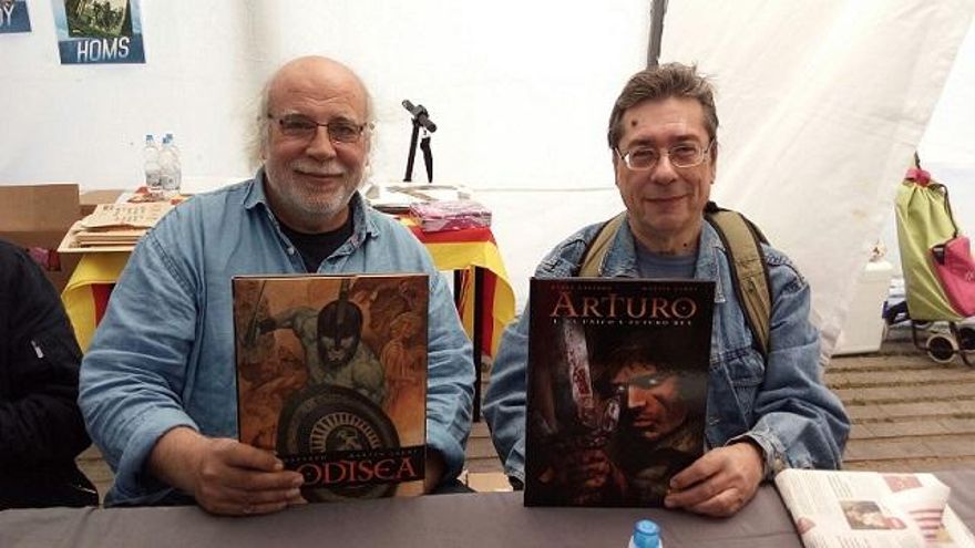 José María Martín Saurí, con un ejemplar de la edición en color de La Odisea y Francisco Pérez Navarro, sujetando la primera entrega de la serie Arturo.