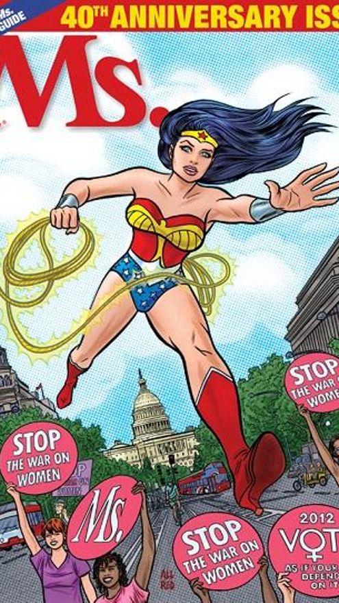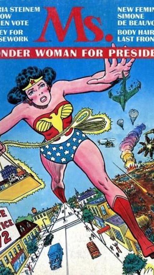 - (B) En 1972, la periodista y editorial Gloria Steinem no se lo ocurrió otra cosa mejor que colocar al personaje de Wonder Woman en la portada del primer número de la revista Ms. Aquel movimiento no fue fruto del azar sino un claro intento de saltar a la arena polítca apoyar a candidatura de la congresista demócrata Shirley Anita St. Hill Chisholm para competir contra Richard Nixon en las elecciones de ese mismo año. La congresista afro-americana –segunda mujer no caucásica que logró un escaño-, tuvo como compañera de viaje y competidora a la también congresista demócrata Patsy Matsu Takemoto Mink, la primera japonesa-estadounidense elegida para el congreso y, por ende, primera mujer no caucásica en llegar a desempeñar una labor mayoritariamente masculina. Además, la portada del magazine tuvo mucho que ver con la vuelta a los orígenes del personaje gráfico, tras unos años en los que Diana fue una sombra de sí misma, privada de sus poderes y de aquel espíritu contestatario que revolucionó y conmocionó al mundo gráfico. A raíz de la publicación del primer número de la revista, la editora decidió presentar un tomo recopilatorio el cual incluyera las mejores historias clásicas del personaje (Steinem, Gloria and Chesler, Phyllis. “Wonder Woman”. Bonanza Books. 1972). En la introdución de dicho volumen recopilatorio, Gloria Steinem escribió; Wonder Woman symbolizes many of the values of the women's culture that Feminists are now trying to introduce into the mainstream: strength and self-reliance for women; sisterhood and mutual support among women; peacefulness and esteem for human life; a diminishment both of 'masculine' aggression and of the belief that violence is the only way of solving conflicts
