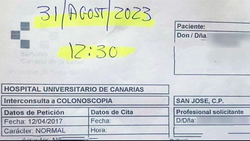 La Plataforma por la Defensa de La Sanidad Pública insiste en que estas situaciones que viven estos pacientes son frecuentes en las Islas y afirma que recibe una gran cantidad de quejas por este asunto. Uno de los casos más llamativos es el de una mujer a quien le han dado cita para una colonoscopia para el año 2023, a pesar de haberla pedido en 2017. Hay otra persona que solicitó ser atendida desde 2015 en neurocirugía y le concedieron la consulta para 2018, tres años de espera como en los dos casos anteriores.
