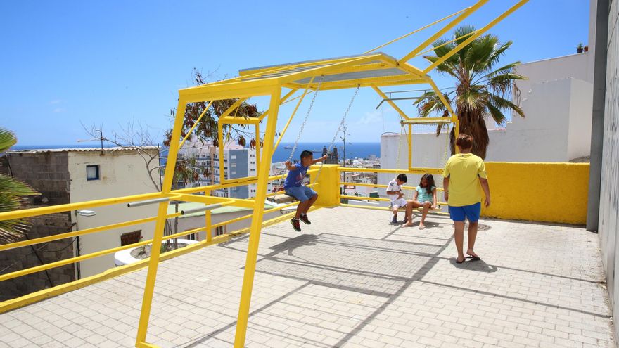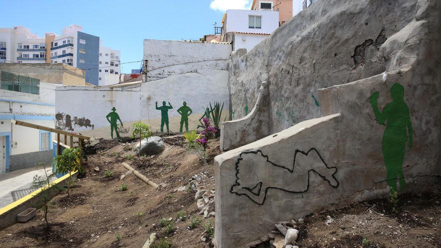 El primer punto de los trabajos tuvo lugar en el espacio existente en la intersección de la calle Madera con las escalinatas. Donde antes había un solar lleno de escombros y basuras, ahora ha comenzado a nacer un jardín decorado en sus paredes con siluetas de habitantes del Risco, una pérgola para dar sombra y también un columpio. “Ahora queremos un punto de riego para poder cuidar la vegetación”, cuenta Agustín Suárez, conocido como Tana en el vecindario. Y es que una de las claves de este proyecto es que son los propios moradores de San Nicolás quienes se encargarán del cuidado de los nuevos parques. Uno de estos cuidadores es Antonio Santana, quien estos días cedió el uso del agua y la luz necesarias para la maquinaria que se ha empleado y que se encarga de regar el nuevo jardín.