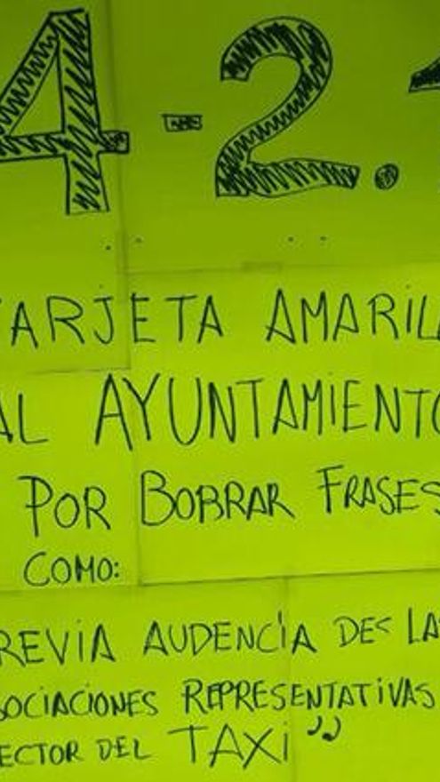 Unos 800 taxistas de la capital grancanaria, de los 1600 que hay en la ciudad, han colgado en sus vehículos estos carteles simulando a una “tarjeta amarilla que le sacan al Ayuntamiento” como muestra de protesta a la modificación del artículo 4.2.1 del nuevo reglamento.