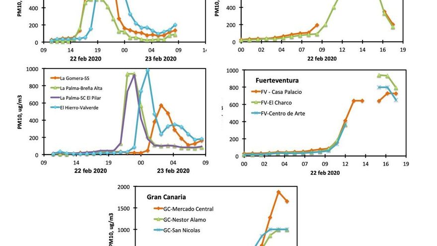 El científico del CSIC Sergio Rodríguez, natural de Lanzarote, ha venido advirtiendo estos días en las redes sociales de la alta concentración de estos materiales en el aire. Este mismo domingo alertó de que el polvo en suspensión había alcanzado valores récord y que la OMS recomienda no estar expuestos a concentraciones de más de 50 microgramos por metro cúbico de aire. Sin embargo, los valores registrados en las islas están sobrepasando ampliamente ese umbral: Gran Canaria, 1.872 microgramos; Tenerife, 1.000; El Hierro, 981; Lanzarote, 969; Fuerteventura, 941; La Palma, 938, y La Gomera, 572 microgramos.