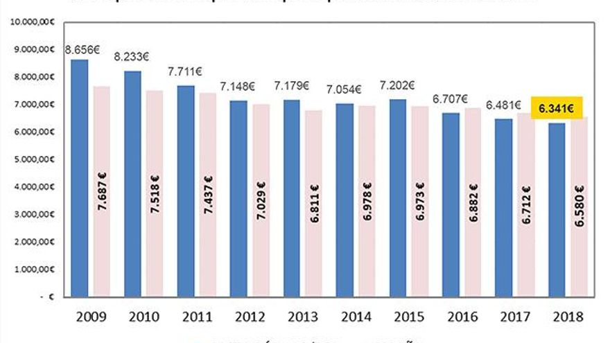 El Observatorio para la dependencia detalla que el coste total del sistema en Canarias apenas alcanza los 177 millones de euros, de los cuales la comunidad autónoma aporta el 80% del gasto público (118 millones) y el Estado el 20% restante (29 millones). En este sentido, recoge que el Archipiélago ha dejado de recibir del Estado 10,9 millones de euros en 2018 como consecuencia de los recortes en los últimos años y, desde 2012, ha dejado de percibir 76 millones de euros.