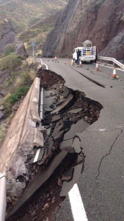 El consejero detalló que el desplome se produjo en el kilómetro 14 de la carretera, donde cedió un muro de contención de hormigón y piedra de unos 25 metros de largo y 5 de alto, aproximadamente, debido a un corrimiento de tierra producido por la lluvia, esto obligó al cierre de la carretera desde El Risco a La Aldea.