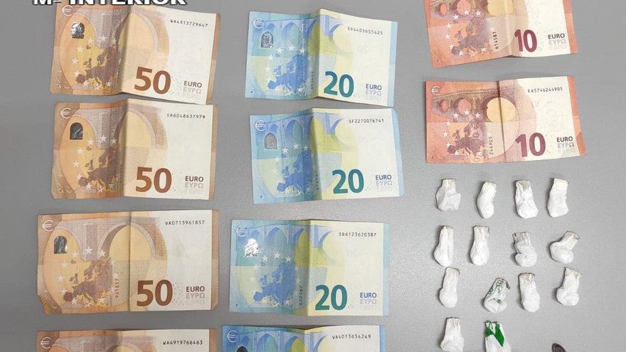 La Guardia Civil realizó las comprobaciones oportunas, basadas en la identificación y un posterior registro superficial a los detenidos, así como en el interior del vehículo, en el que localizaron un monedero oculto con 14 envoltorios en su interior que sumaban siete gramos de cocaína, en unión a 300 euros en efectivo fraccionados en billetes de diverso valor.
