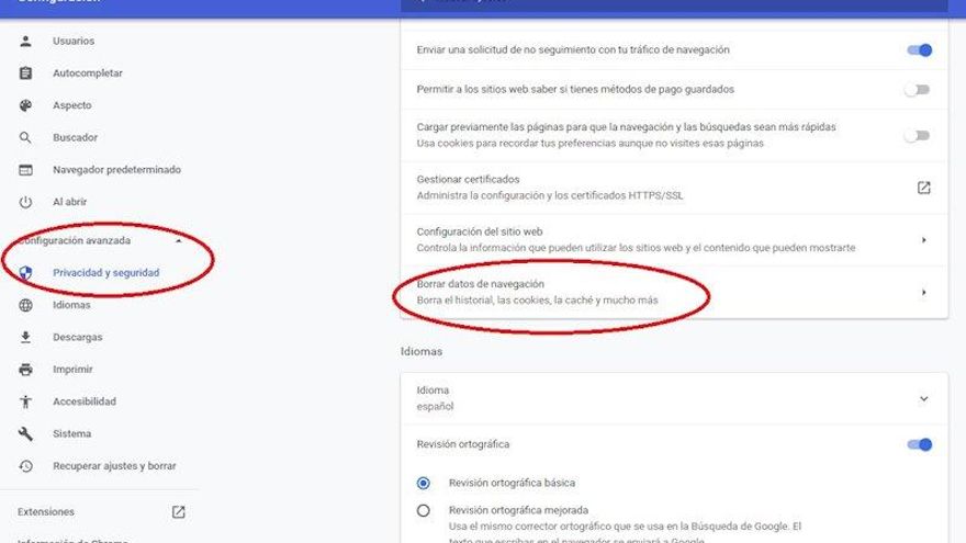 En el caso de Chrome, se accede a través de 'Configuración', dentro del botón con tres puntos verticales situado en la esquina superior derecha del navegador. Allí, hay que acceder a 'Borrar datos de navegación', dentro de 'Configuración avanzada'. Entonces, aparecerá una ventana con dos modalidades, cada una con varias opciones: el modo básico y la configuración avanzada.