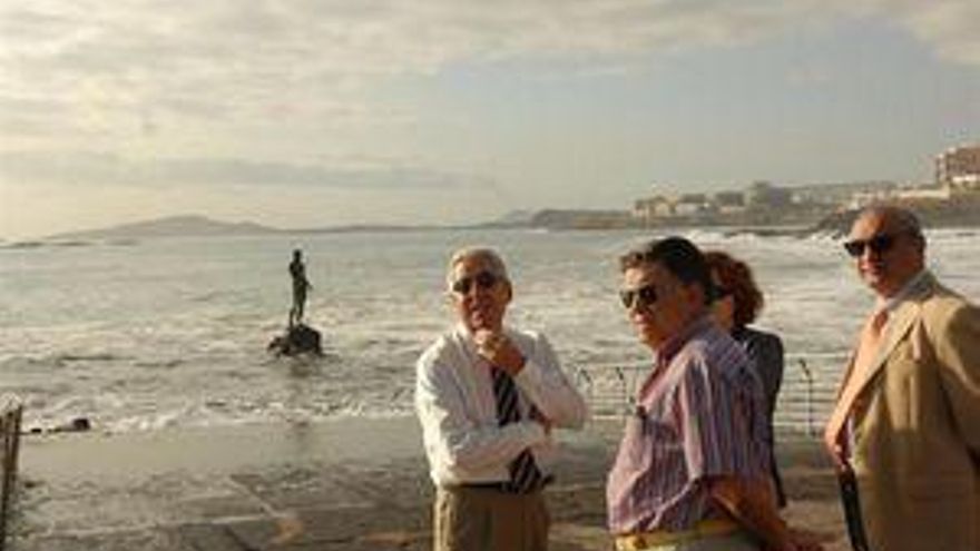 El alcalde de Telde, Aureliano Francisco Santiago Castellano, acudió a primera hora de este jueves a la playa de Melenara para valorar y estudiar los desperfectos que las olas han ocasionado a la escultura del Neptuno, obra del artista Luis Arencibia.