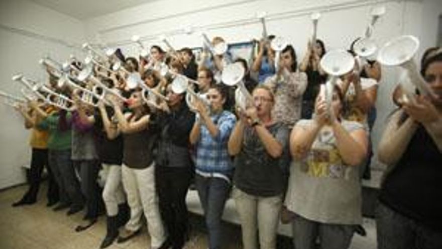 Dan las 20.30 horas y las jóvenes se van colocando en el interior del local con sus trompetas en mano mientras Walkiria les informa de las novedades del día. Todo listo para empezar a entonar.