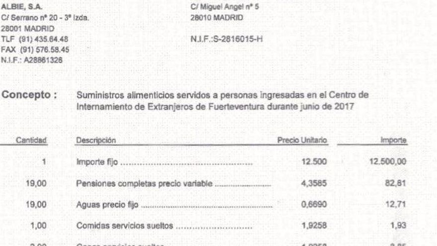 En los albaranes de la empresa Albie, que se llevó el contrato del Ministerio, se detalla con claridad que el concepto es el de “suministros alimenticios servidos a personas ingresadas en el Centro de Internamiento de Extranjeros de Fuerteventura”. También se refleja el citado importe fijo de 12.500 euros, que ha sido cuestionado en el Senado cuando se ha analizado la situación del CIE, y diversos importes “variables” por servir pensiones completas (desayuno, almuerzo y cena) a los detenidos de la Comisaría, así como comidas y botellas de agua “sueltas”. Cada albarán incorpora un cuadro con los menús servidos cada día del mes, con el sello de la Comisaría de Puerto del Rosario.