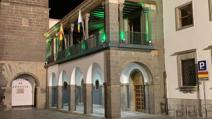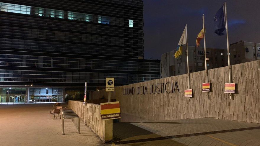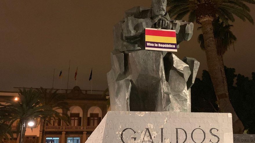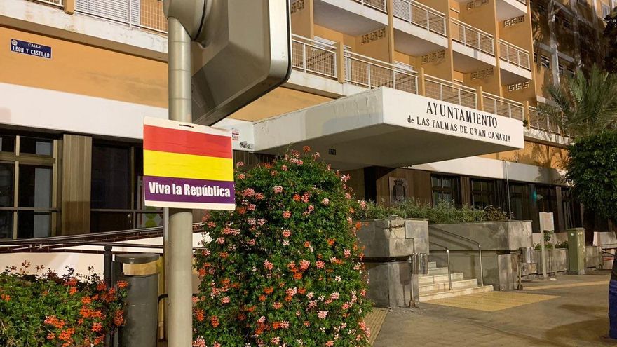 Entre otros lugares, estas pancartas con la enseña republicana y el mensaje Viva la República se ha instalado en el Ayuntamiento de la capital, en el Palacio de Justicia situado en la plaza San Agustín, en la entrada a los juzgados, el edificio de la Marina o la escultura de Benito Pérez Galdós en la Plaza de La Feria.