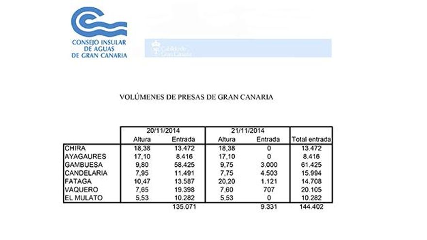 La presa que más precipitaciones albergó fue la de Gambuesa, ubicada en el municipio de San Bartolomé de Tirajana, que cuenta con un volumen máximo de 1.348.000 metros cúbicos. Esta presa recibió 135.071 metros cúbicos el 21 de noviembre y 9.331 al día siguiente.