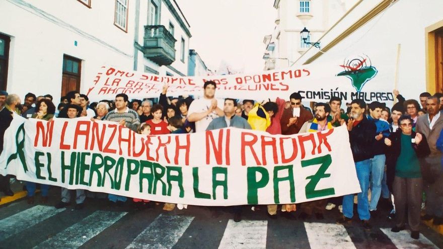 Las conocidas como Islas Verdes también se han movilizado en defensa de su territorio. Entre 1986 y 1988 empezó la lucha de El Hierro en contra del radar de Malpaso y el Centro de Lanzamiento Espacial. La población no quería una isla militarizada. En diciembre de 1996, los ciudadanos daban un paso al frente y salía a las calles de Valverde para manifestarse en contra del proyecto del ministerio de Defensa. Más de 4.000 personas gritaron alto y claro que “había que pararlo”, rememora Samuel Acosta, portavoz de la asociación cultural Ossinisa.
