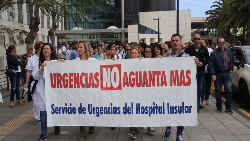 Los médicos de Urgencias del Hospital Insular de Gran Canaria, acompañados por profesionales sanitarios y no sanitarios y usuarios del complejo, se han concentrado este viernes a las puertas del centro para reafirmarse en su denuncia ante la Fiscalía y censurar públicamente las declaraciones realizadas el pasado martes por el presidente del Gobierno, Fernando Clavijo, unas manifestaciones en las que deslizaba que parte de la responsabilidad del colapso en el servicio recaía en los propios trabajadores. La acción reivindicativa, en la que han participado alrededor de 300 personas, según la estimación de algunos de los organizadores, ha finalizado con un recorrido de ida y vuelta desde el edificio del Hospital Insular al del Materno Infantil, una marcha en el que los participantes han coreado consignas en defensa de la sanidad pública y en contra del negocio con la salud.