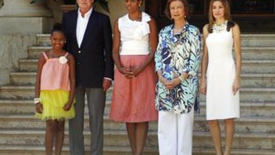 La hija del presidente estadounidense Barack Obama y su mujer Michelle, Sasha, ha protagonizado el posado de la primera dama con los Reyes y la Princesa Doña Letizia en el Palacio de Marivent al insistir en querer salir en la foto oficial, llegando incluso a tirar del brazo del Rey Don Juan Carlos en el momento en que éste se disponía a acompañarla unos metros más allá para que se pudiera llevar a cabo la fotografía.
