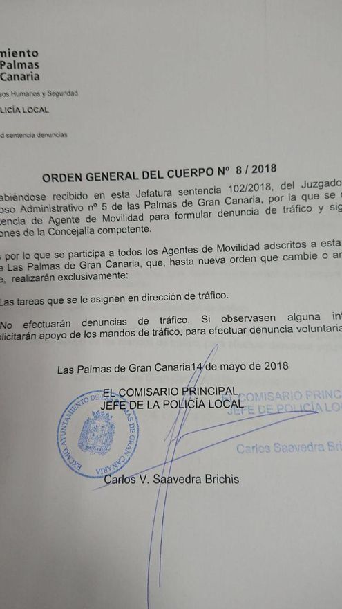 La orden de este lunes está sustentada en una nueva sentencia, esta vez del Juzgado de lo Contencioso Administrativo número 5 de Las Palmas de Gran Canaria, por la que se declara la incompetencia de los agentes de movilidad para formular denuncias de tráfico. No es la primera, ya que han salido otras sentencias que anulan multas interpuestas por este cuerpo.