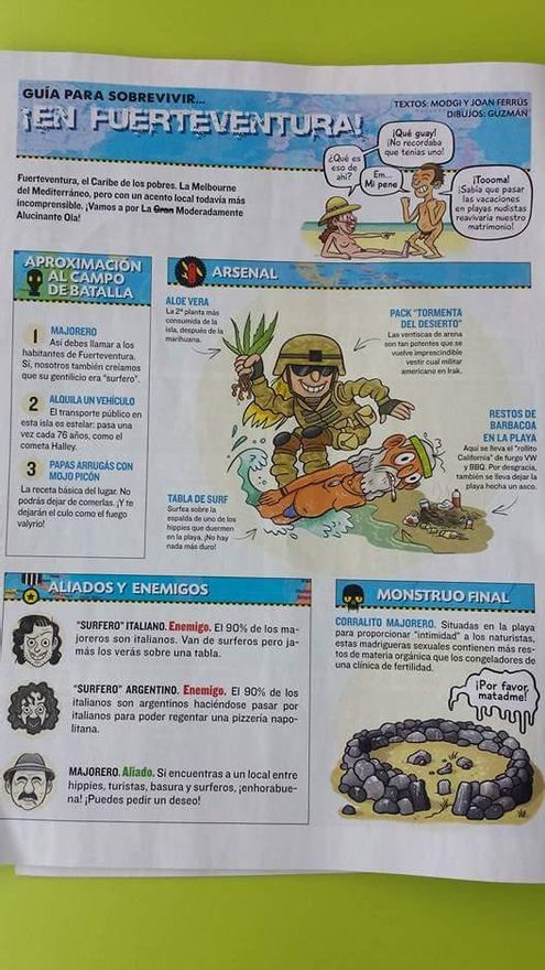 También dice irónicamente que “se lleva el rollito California de furgo VW y BBQ. Por desgracia también se lleva dejar la playa hecha un asco”, y se burla del transporte público añadiendo que en Fuerteventura “es estelar, pasa una vez cada 76 años, como el cometa Halley”.