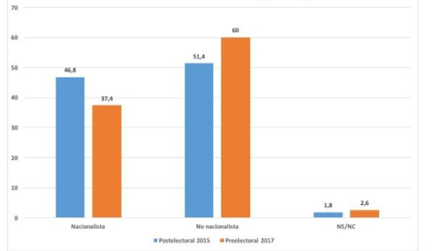 Otra cosa curiosa del preelectoral del CIS es que se considera nacionalista catalán solo el 37,4% de la muestra. Dato notablemente inferior al postelectoral del 2015 (46,8%), once puntos menos. Eso supone que, probablemente, el voto a los partidos soberanistas no está compuesto exclusivamente de nacionalistas, sino que se ha ido alimentando de sectores disconformes con el trato a Cataluña por parte del Gobierno central y que no coinciden con el tradicional votante de CiU o ERC. Elemento significativo para identificar los problemas y las posibles soluciones.