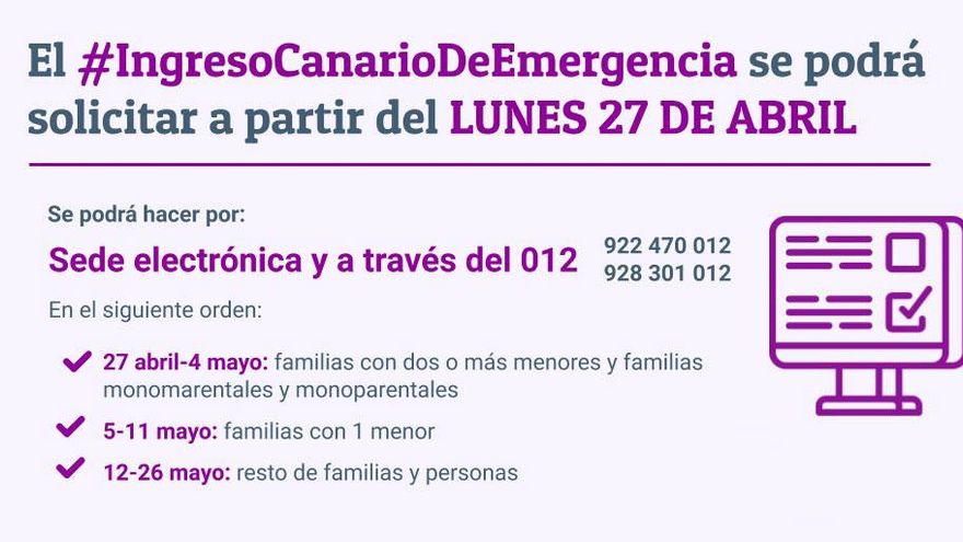 La solicitud de este ingreso mínimo ha arrancado este lunes y en una sola mañana se gestionaron más de 400 solicitudes. A las 20.00 horas eran 3.507 personas atendidas y 1.684 solicitudes tramitadas. Puede tramitarse de forma electrónica ( a través de https://sede.gobcan.es/dsidj/) y será necesario tener el certificado digital o el sistema @clave y si no se puede tramitar en el teléfono 012. “A efectos de prueba y registro, la llamada será grabada”, destaca el decreto.