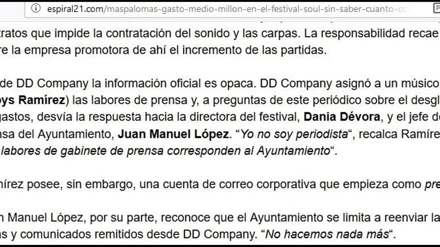 El mismo tono amenazante empleó el periodista en sus artículos de Espiral 21, en los que también criticó que “la cuenta de correo corporativa [de la productora DD & Company] empieza como prensa”, haciendo referencia a que el profesional que se ocupa de esas funciones, que presta sus servicios en una entidad privada, es músico en lugar de periodista. Los ataques al festival se han basado fundamentalmente en el coste económico que supone para el principal patrocinador, el Ayuntamiento de San Bartolomé de Tirajana, sin entrar en detalles del cartel de artistas. Igualmente ha enfatizado lo que el periodista ha llamado la “falta de transparencia” que asegura que ha percibido por parte de la organización y del consistorio. En uno de sus artículos llegó a poner en relación la inversión en este acontecimiento cultural y de promoción turística (175.000 euros) con la penosa situación de salud y de precariedad económica que padece una mujer de San Fernando de Maspalomas.