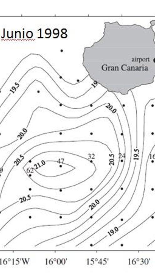 En las imágenes facilitadas por el profesor se aprecian los remolinos que se generan en el suroeste de la Isla. En la primera se puede ver cómo la distribución de la temperatura a 200 metros de profundidad muestra la señal de un remolino anticiclónico de núcleo cálido y en la segunda, la señal de un remolino de núcleo frío ciclónico.