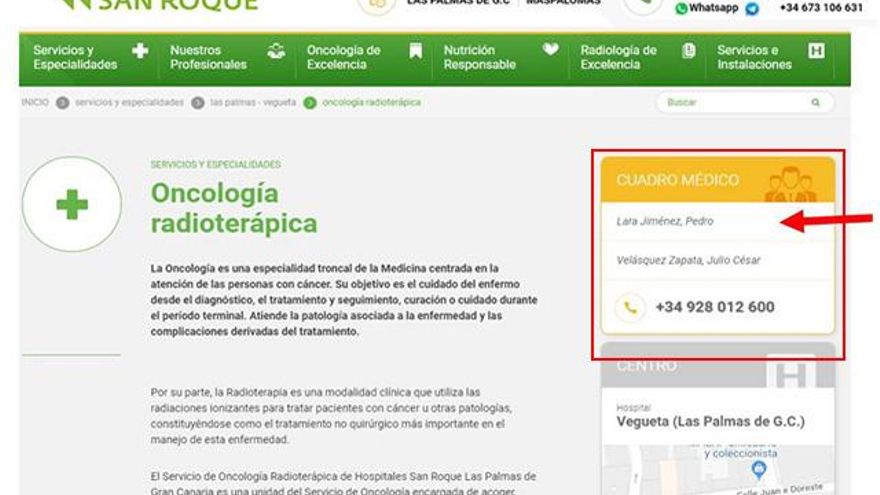 Pedro Lara figuraba hasta hace escasas semanas en la página web de Hospitales San Roque, en el cuadro médico del servicio de Oncología Radioterápica de este centro. Sin embargo, su nombre ya ha desaparecido de la relación de profesionales de la clínica.
