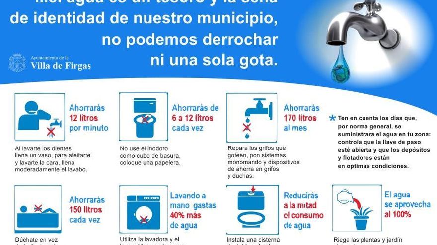 El consistorio avisó a través de sus redes sociales este mismo miércoles por la mañana de que “a partir” de ese día se iban a producir restricciones en el suministro de agua potable en el municipio. Una información que acompañaba de una infografía sobre la importancia de “no derrochar” agua, “un tesoro” y “seña de identidad” de Firgas.