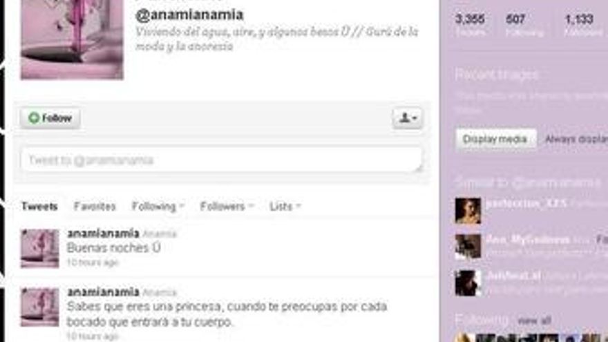 La proliferación de mensajes que promueven la anorexia y la bulimia a través de redes sociales como Twitter ha generado la creación y fortalecimiento de modelos a seguir por aquellos jóvenes que encuentran en Internet un lugar en el que compartir sus deseos por estar cada vez más delgados, según denuncian los expertos.