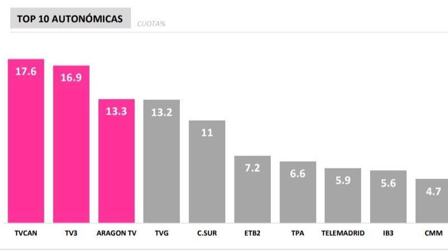 La Televisión Canaria, con un 17,6% de cuota de pantalla, supera a las emisiones de TV3 (16,9%) y se sitúa en cabeza de las autonómicas más vistas, muy por encima de Telemadrid, que solo cosechó un 5,9%.