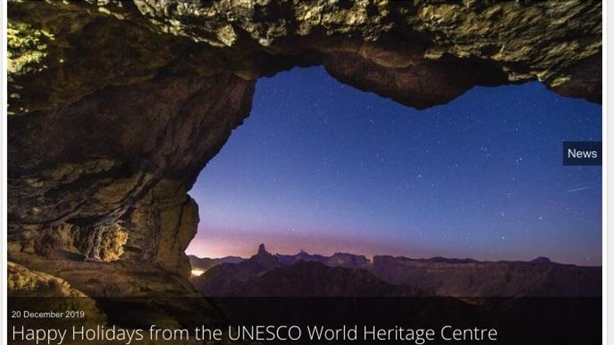 El Centro de Patrimonio Mundial de la UNESCO ha usado una imagen de la cuenca de Tejeda en Gran Canaria para felicitar la Navidad. La foto fue captada desde una cueva de Acusa Seca poco antes del amanecer bajo un espectacular cielo estrellado, en el corazón del Paisaje Cultural de Risco Caído y las Montañas Sagradas de Gran Canaria.