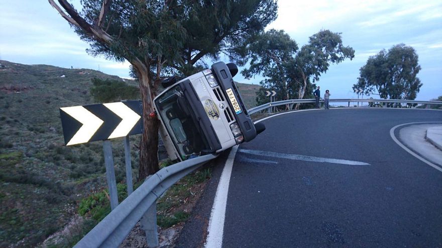 Una camioneta ha patinado sobre una valla quitamiedos mientras circulaba en la carretera de Tenteniguada, en el municipio grancanario de Valsequillo. El vehículo se ha salvado de caer al precipicio gracias a dos eucaliptos que lo frenaron.