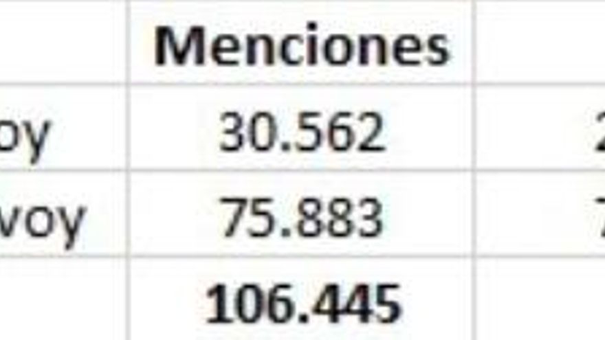 En total, las menciones a #yovoy han sido hasta el momento 30.562, un 28,7%, frente a las 75.883 (71,3%) de menciones a #yonovoy.