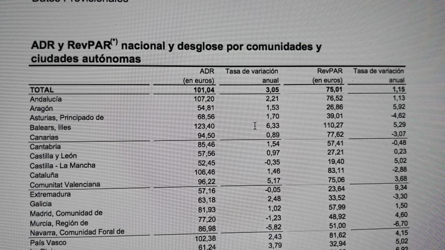 Así se confirma en el mencionado trabajo técnico, que además detalla que la comunidad autónoma de Canarias aminora sus entradas dinerarias por habitación disponible (el conocido como RevPAR) el 3,07% respecto al mismo mes del año precedente (2017, o sea, un dato interanual). Con esta caída, la variable absoluta de ingreso por habitación ofertada se sitúa en 77,62 euros por día.