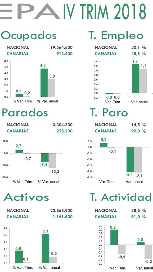 Canarias ha recibido de la Encuesta de Población Activa (EPA) del cuarto trimestre de 2018 (servida este martes por el INE), la que permite el balance enero-diciembre de ese ejercicio anual, varias noticias buenas y otras que siguen siendo malas para el archipiélago.