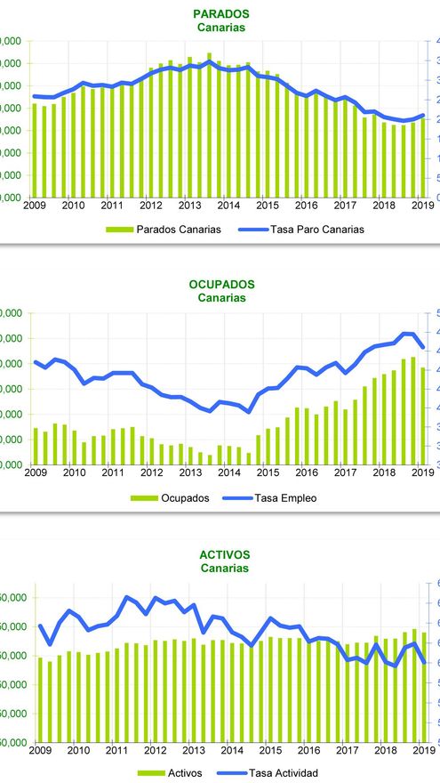 Con ese desplome en el número de empleados en las islas (según los datos de la Encuesta de Población Activa (EPA) de enero-marzo de 2019 -primer trimestre- servidos este jueves por el INE), del 2,29% respecto al cuarto trimestre de 2018, y con el también descenso de los activos, con menos 11.400 personas en el periodo de estudio, el paro solo creció (pues pudo ser peor la cosa) de un trimestre a otro el 4,17% y así se situó en un umbral de 237.700 desempleados en toda Canarias, con una tasa del 21,03% y con Canarias lograr el objetivo de bajar del 20% en desempleo.