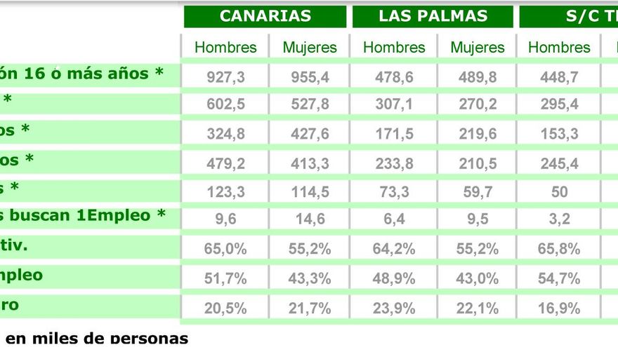Las personas que se encuentran activas en Canarias en cambio alcanzan la cifra de 1,13 millones, si bien en las islas el dato de activos ha bajado respecto al periodo trimestral anterior en 11.400 personas (-1%).