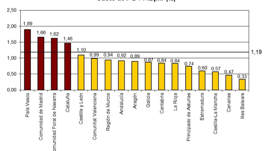 Clasificación según regionesLas comunidades autónomas con mayor porcentaje de gasto en actividades de I+D sobre sus PIB fueron País Vasco (con 1,89%), Comunidad de Madrid (el 1,66%), Comunidad Foral de Navarra (el 1,62%) y Cataluña (el 1,46%).